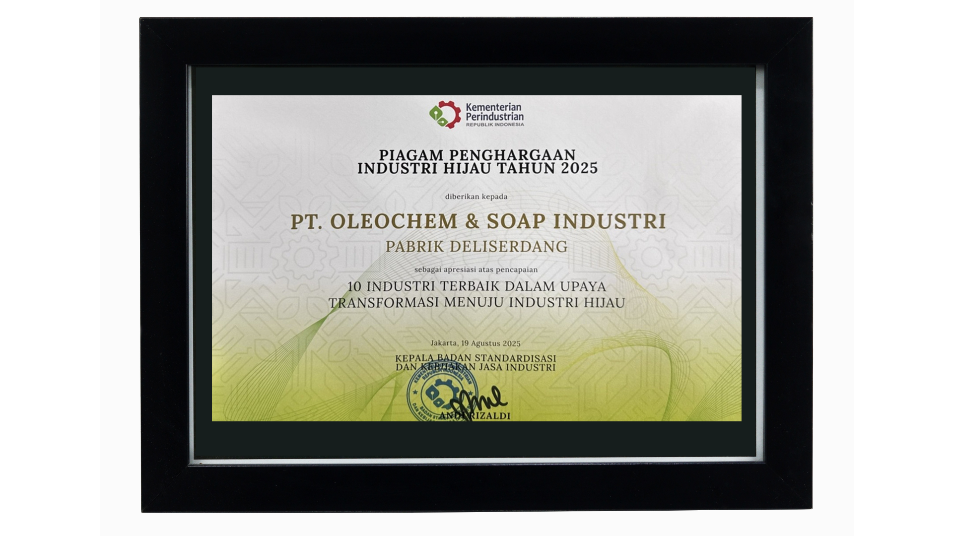 PT.Oleochem & Soap Industri Honored as One of the Best Indonesia’s Top 10 Industrial Companies that successfully driving the transformation towards a Green Industry in 2025. This awards given by Ministry of Industrial - Republic Indonesia on August 20, 2025